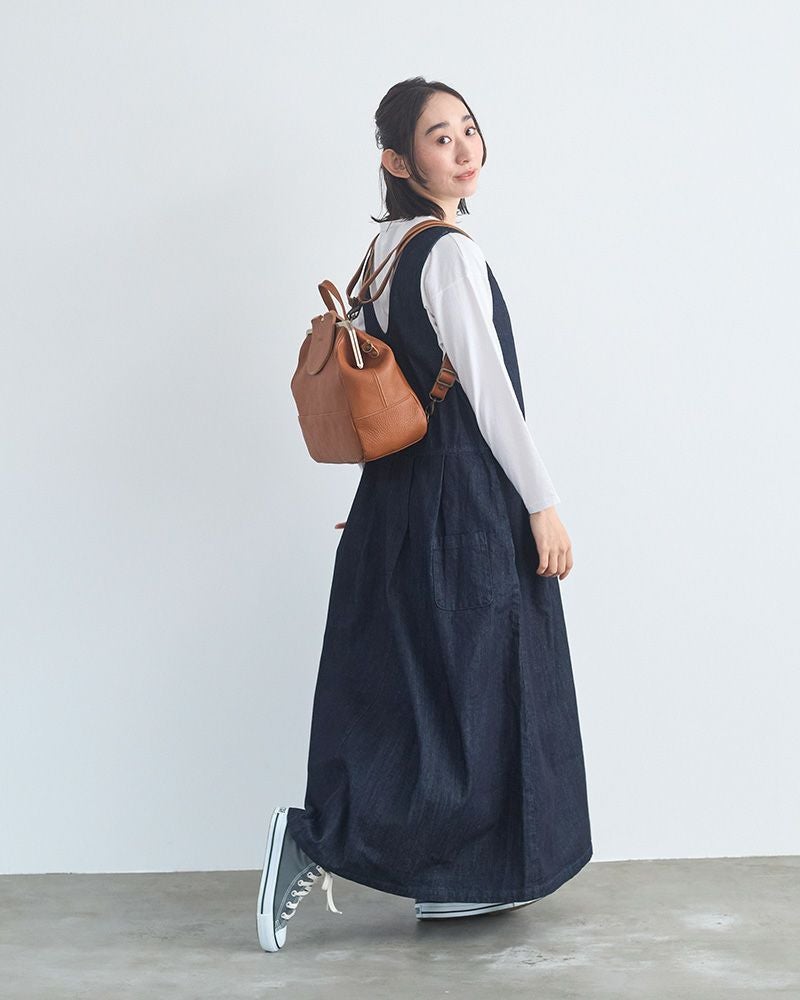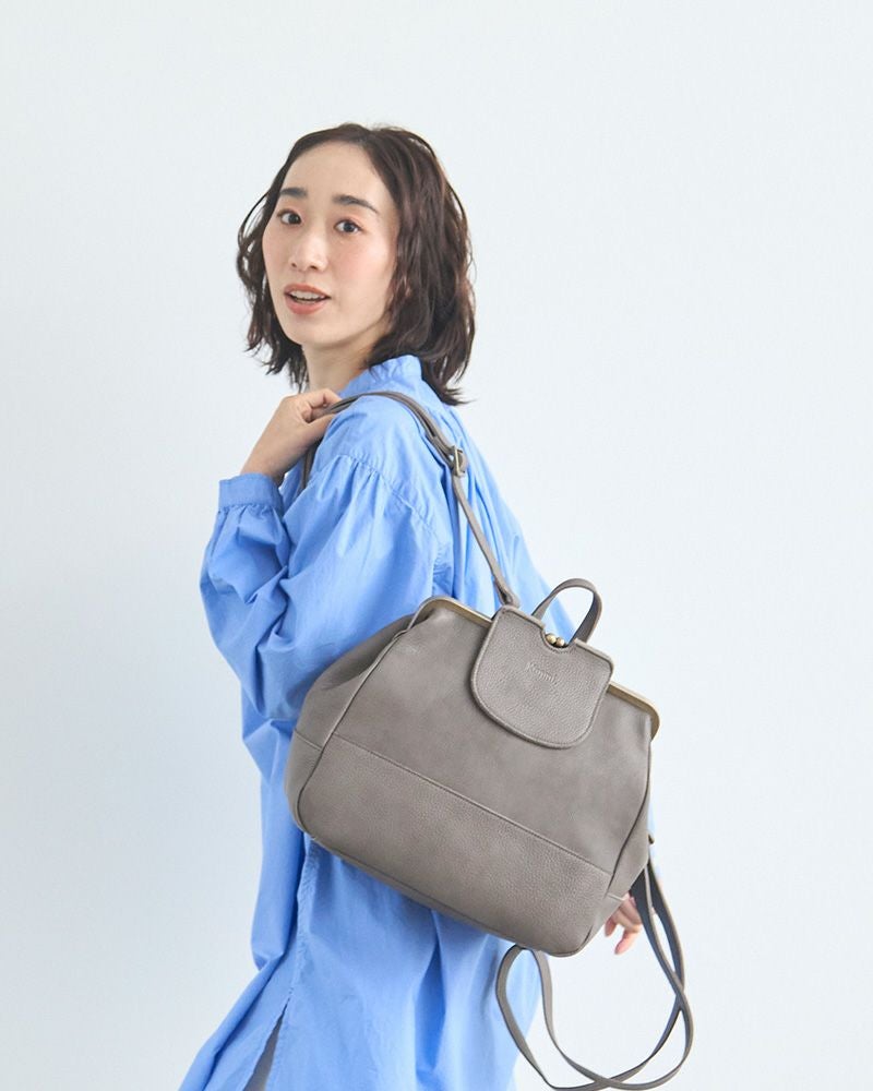 ショルダー紐を背面の金具に付けるとリュックに、がま口の両脇にある金具に付けるとショルダーバッグに。トップについた短めの持ち手を使えばハンドバッグとしても使えます。