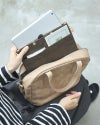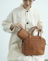 斜めがけと肩掛け、手持ちの3種類の持ち方を楽しめる3WAYのバッグです。長めの細めの持ち手で、ひじにもかけやすく脇にもすっぽりおさまります。秋冬の厚手のセーターやコートを着てもゆったりと背負える、長さがあるショルダーで一年中出番が多いバッグです。革を2枚貼り合わせたショルダーは、しっかりと厚みがあって頼りになります。