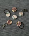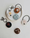 同じ刺繍と革を使ったアイテムは、ヘアゴム、ブローチ、キーリングの3種類。ヘアゴムとブローチなど、アイテム違いで同じ図案を集めればお揃いコーディネートが楽しめます。色や図案の組み合わせでナチュラルかわいくなったり、ニュアンスカラーで大人っぽい雰囲気にも。あなたのお気に入りの組み合わせを見つけてくださいね。